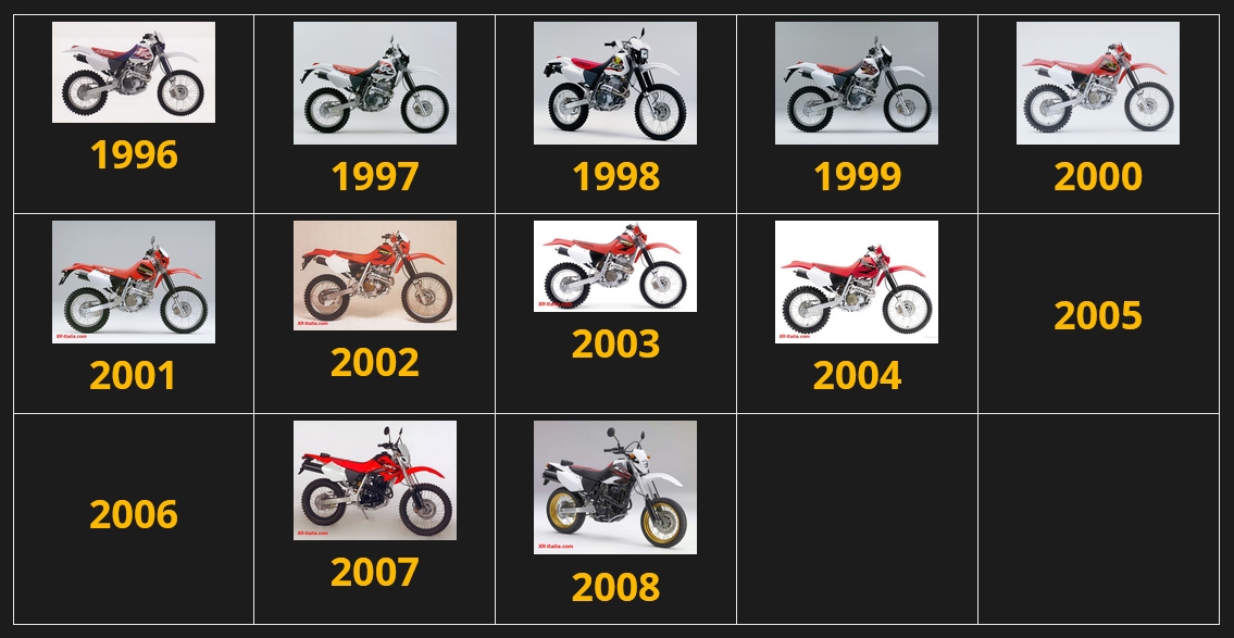 Dal modello 2004, ultimo anno in cui si produrrà l’XR 400R in versione fuoristrada con serbatoio in plastica, l’omologazione passa del tipo locale “OL” a quella europea “EU” e perde la doppia omologazione, i modelli di quest’anno quindi sono o solo Supermotard o solo Enduro.