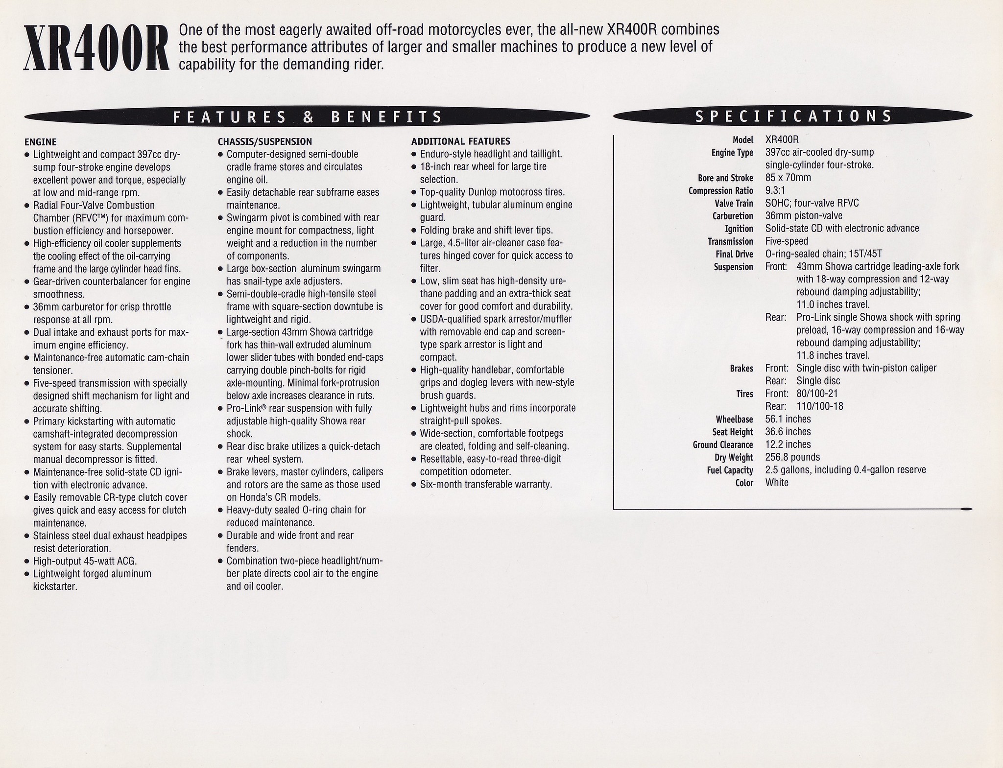 l’XR 400R my ’96 viene messa in commercio nella seconda metà del 1995 insieme alla nuova XR 250R, nuovo telaio parzialmente formato da tubi a sezione quadra, telaietto posteriore scomponibile per facilitare le operazioni di manutenzione su monoammortizzatore e carburatore, forcella tradizionale Showa da 43mm con doppia regolazione, radiatore olio dietro la mascherina portafaro e doppio freno idraulico a disco.